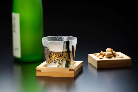 ISHIZUKA Glass Aderia Premium - Bamboo & Tiger Sake Glass With Sandalwood Tray