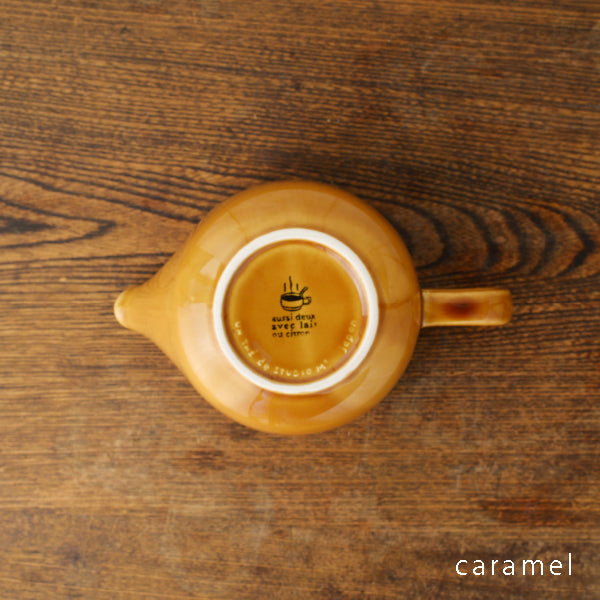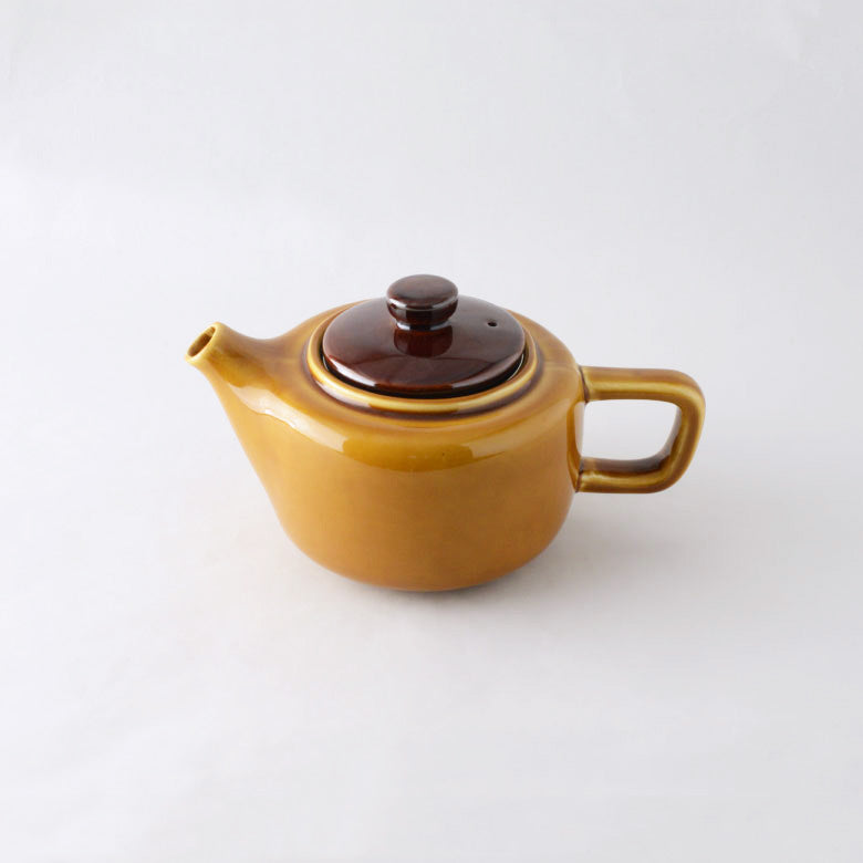 Un the Teapot with a moderately heavy form and casual colors. Matching mugs can be stacked, and placed on the teapot which functioned as a mug warmer.