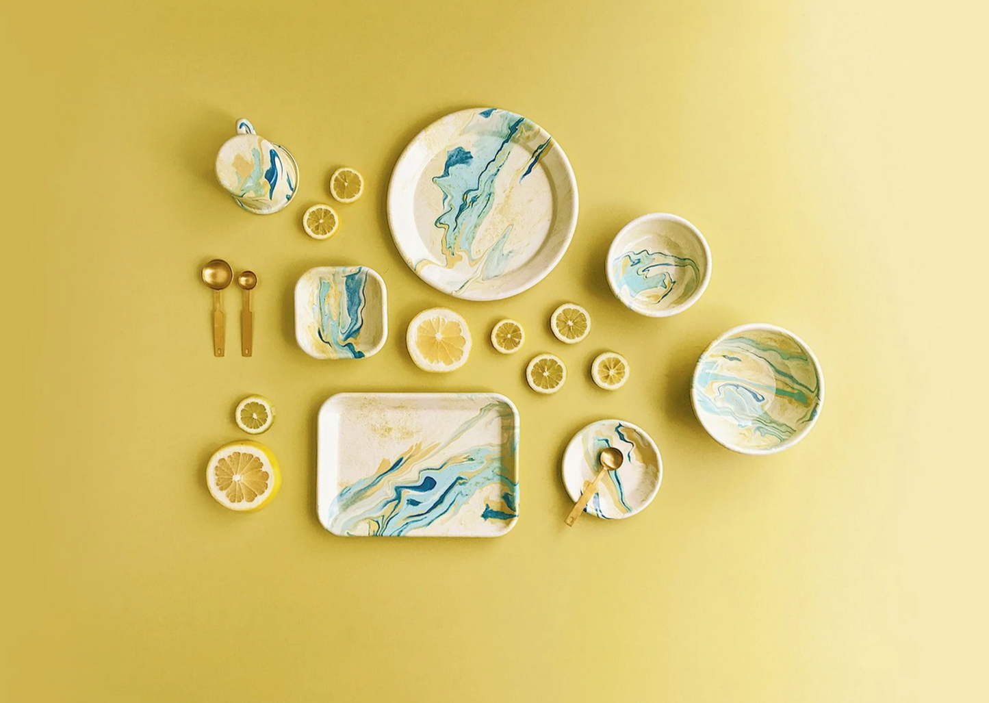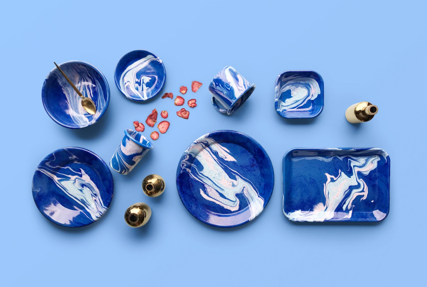 Adopting an innovative approach to classic enamelware. Showing off a swirling pattern that adds visual interest to any space, it’s hand glazed and kiln fired with the best of both quality and aesthetics in mind. The patterns may differ on each item showing the marks of its journey.