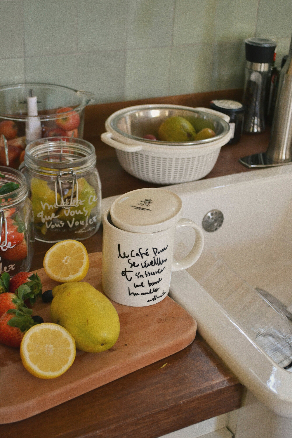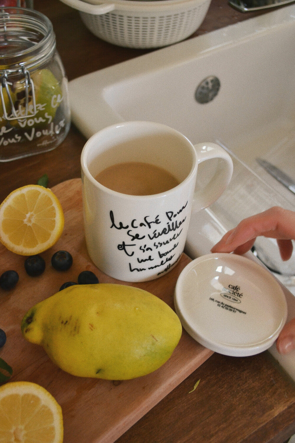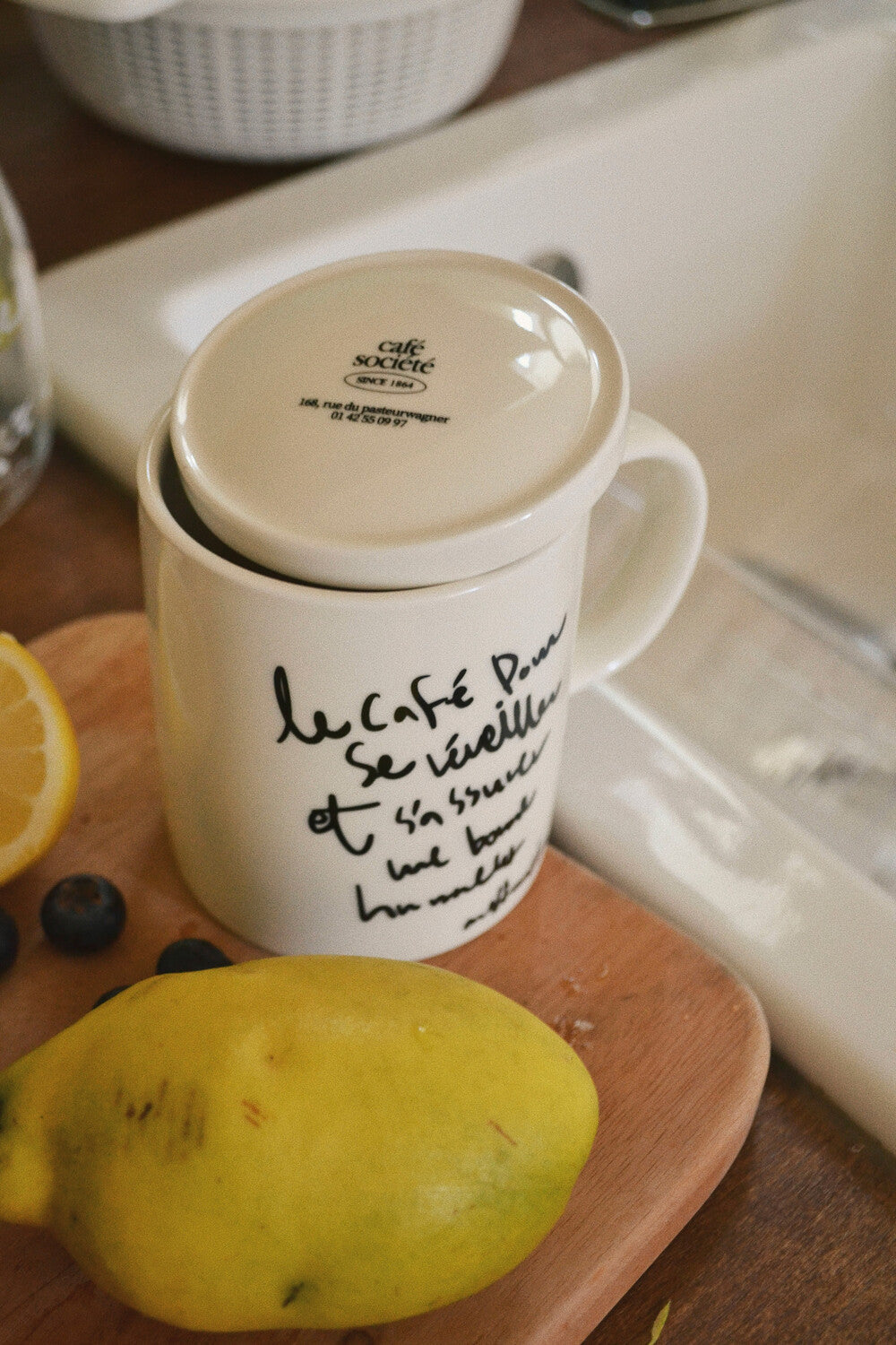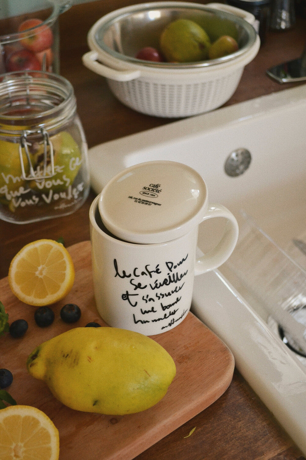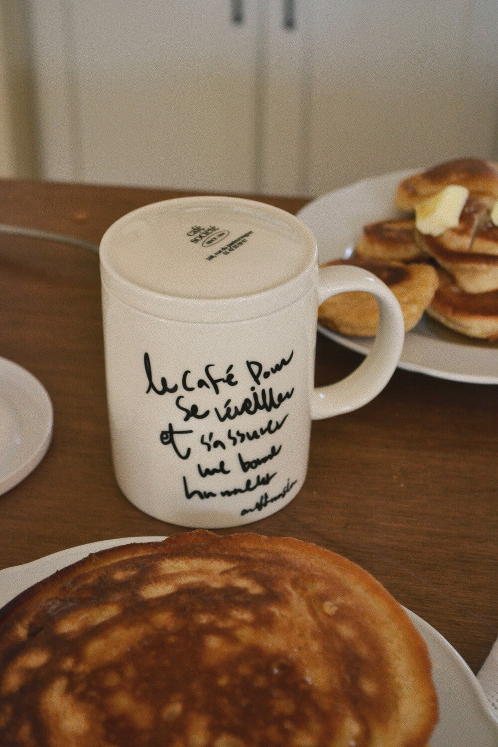 Expresses that it is coffee that wakes you up and makes you feel good, and it is a mug that reminds you of a warm cafe latte. Onoffmansion's unique, rough French hand writing has a unique and artistic feel.