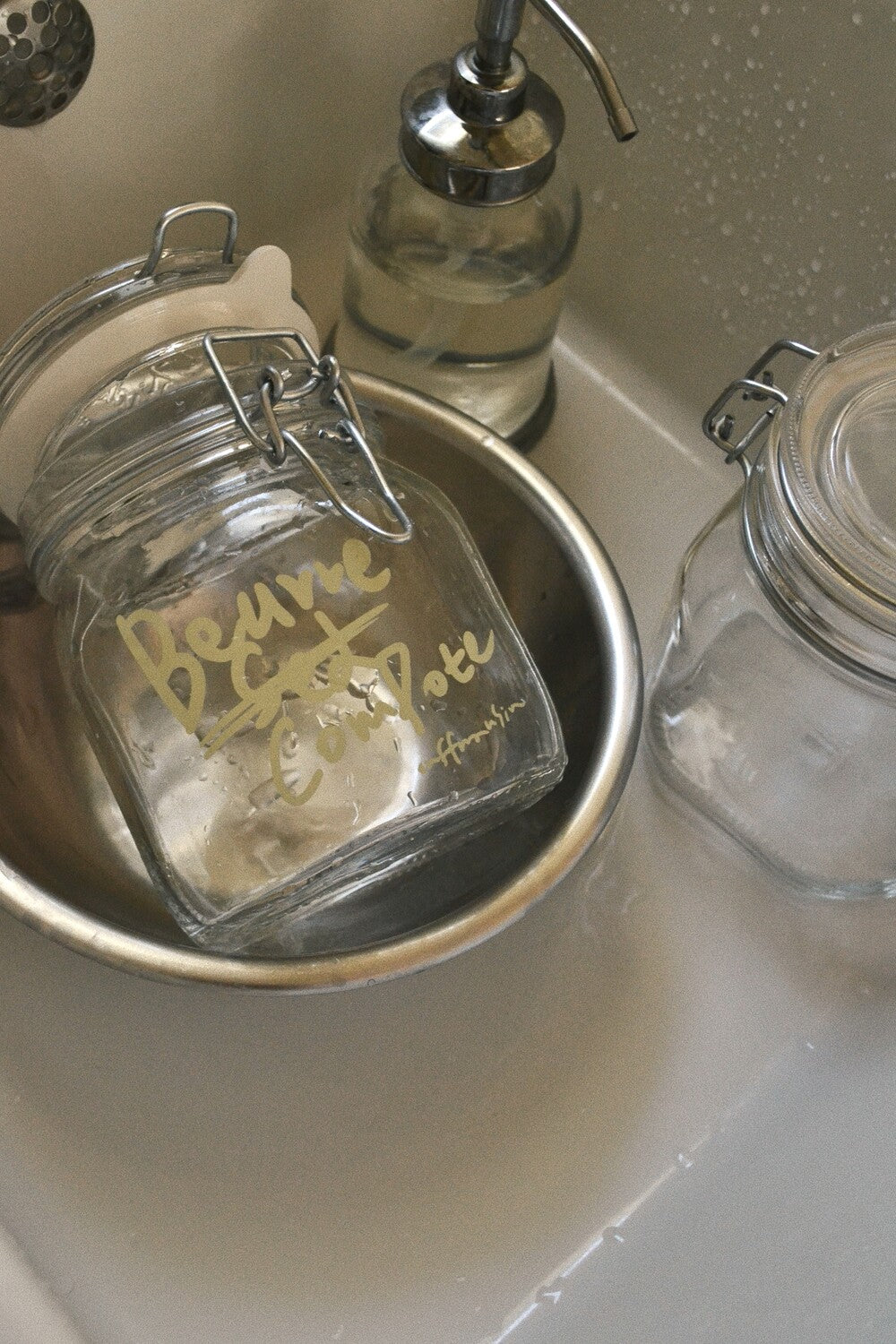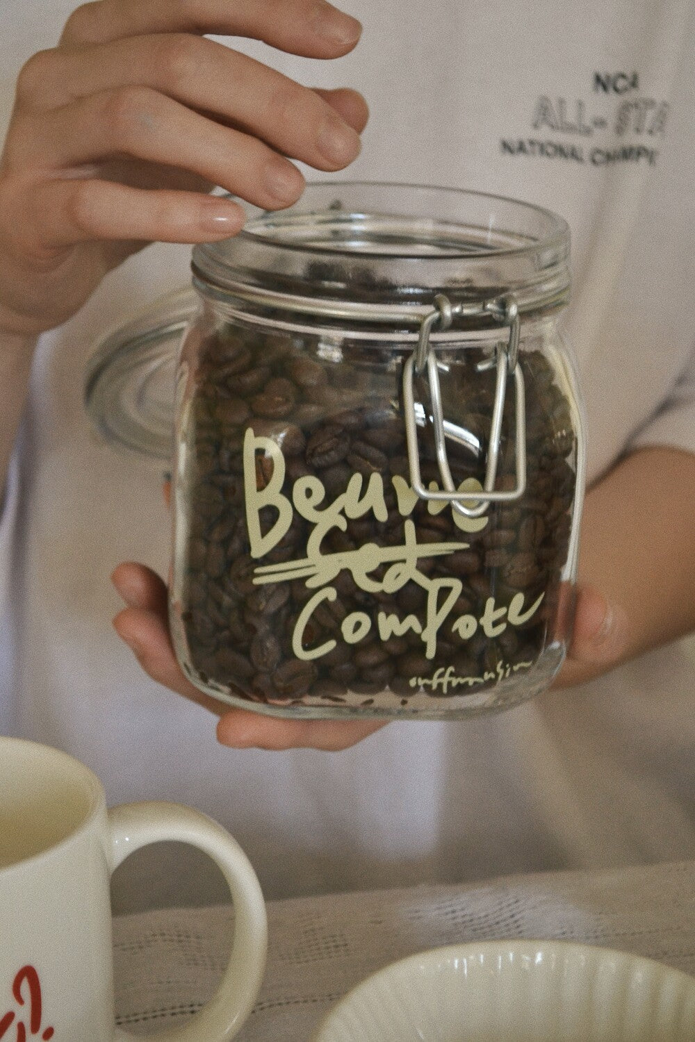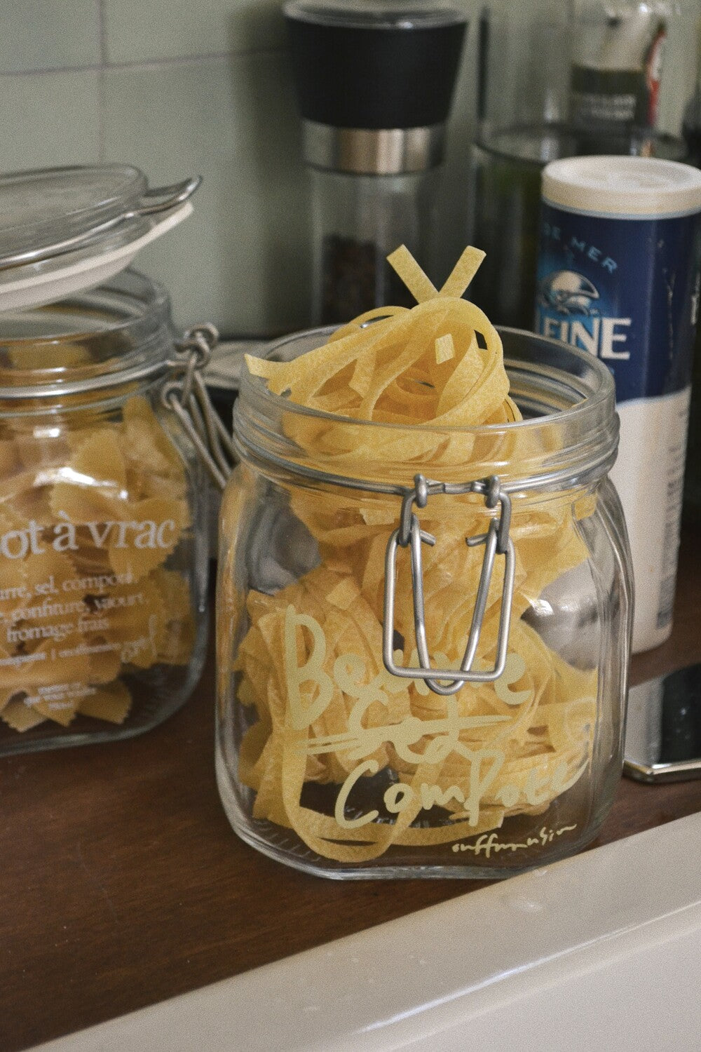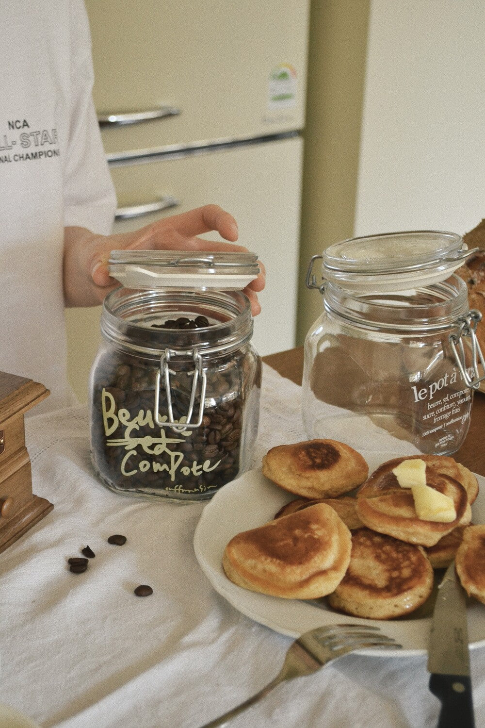 Many of the unwrapped products are packed in reusable glass bottles at En Bach's stores in France. Inspired by this, the Pido bottle, made with Onof Mansion's unique hand lettering design, was produced by the original Italian brand 'Bormioli'. It can be stored with compote, beans, pasta, Greek yogurt, fruit, etc., and can be reused for a long time at any time.