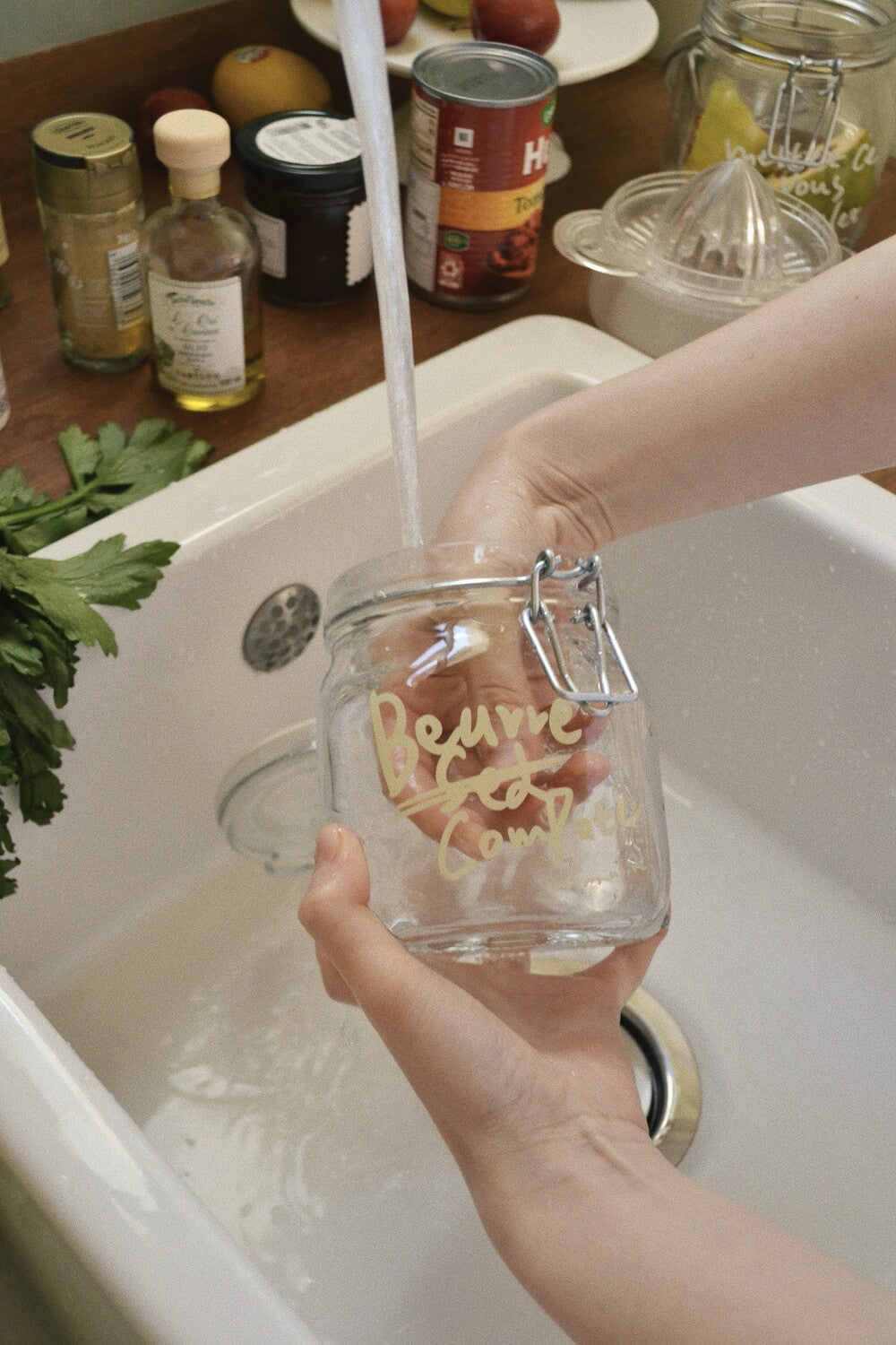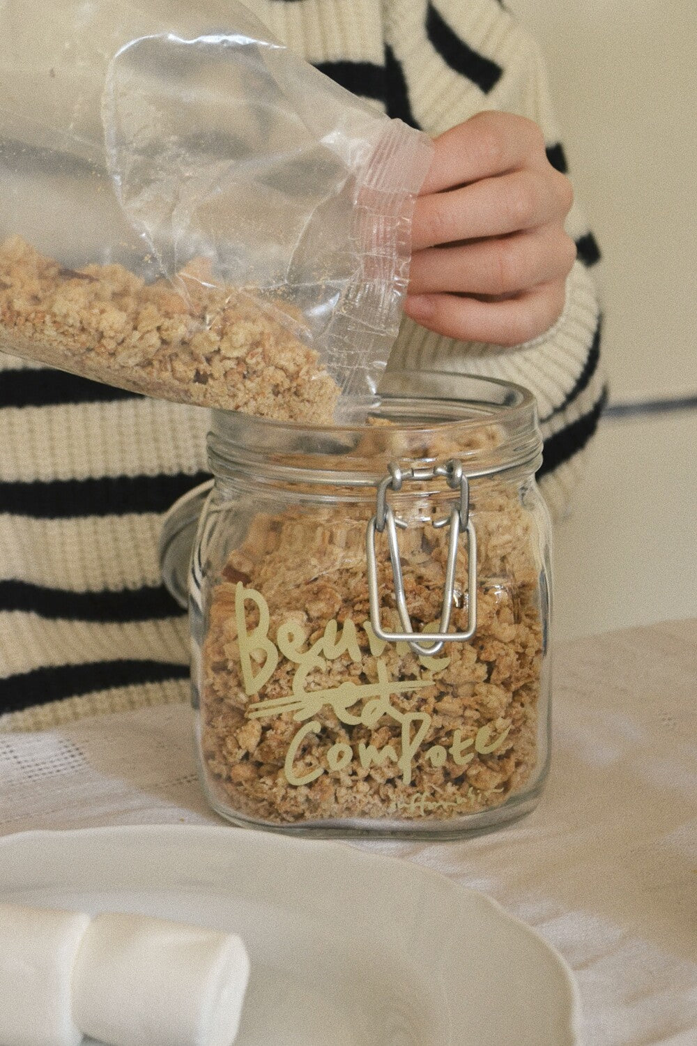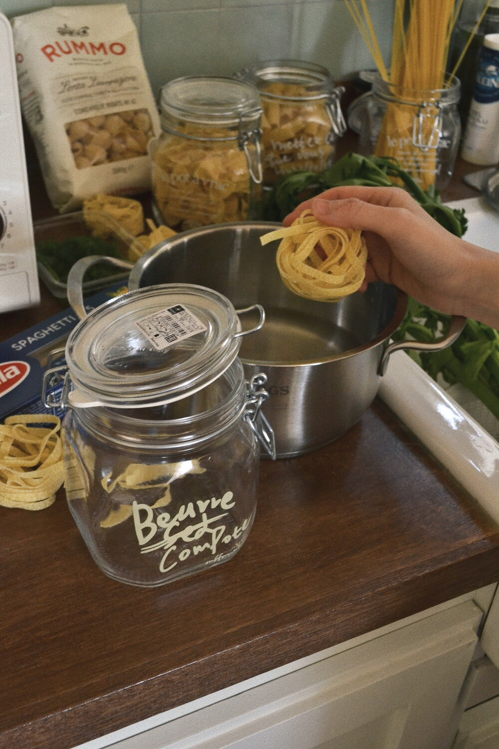 Many of the unwrapped products are packed in reusable glass bottles at En Bach's stores in France. Inspired by this, the Pido bottle, made with Onof Mansion's unique hand lettering design, was produced by the original Italian brand 'Bormioli'. It can be stored with compote, beans, pasta, Greek yogurt, fruit, etc., and can be reused for a long time at any time.