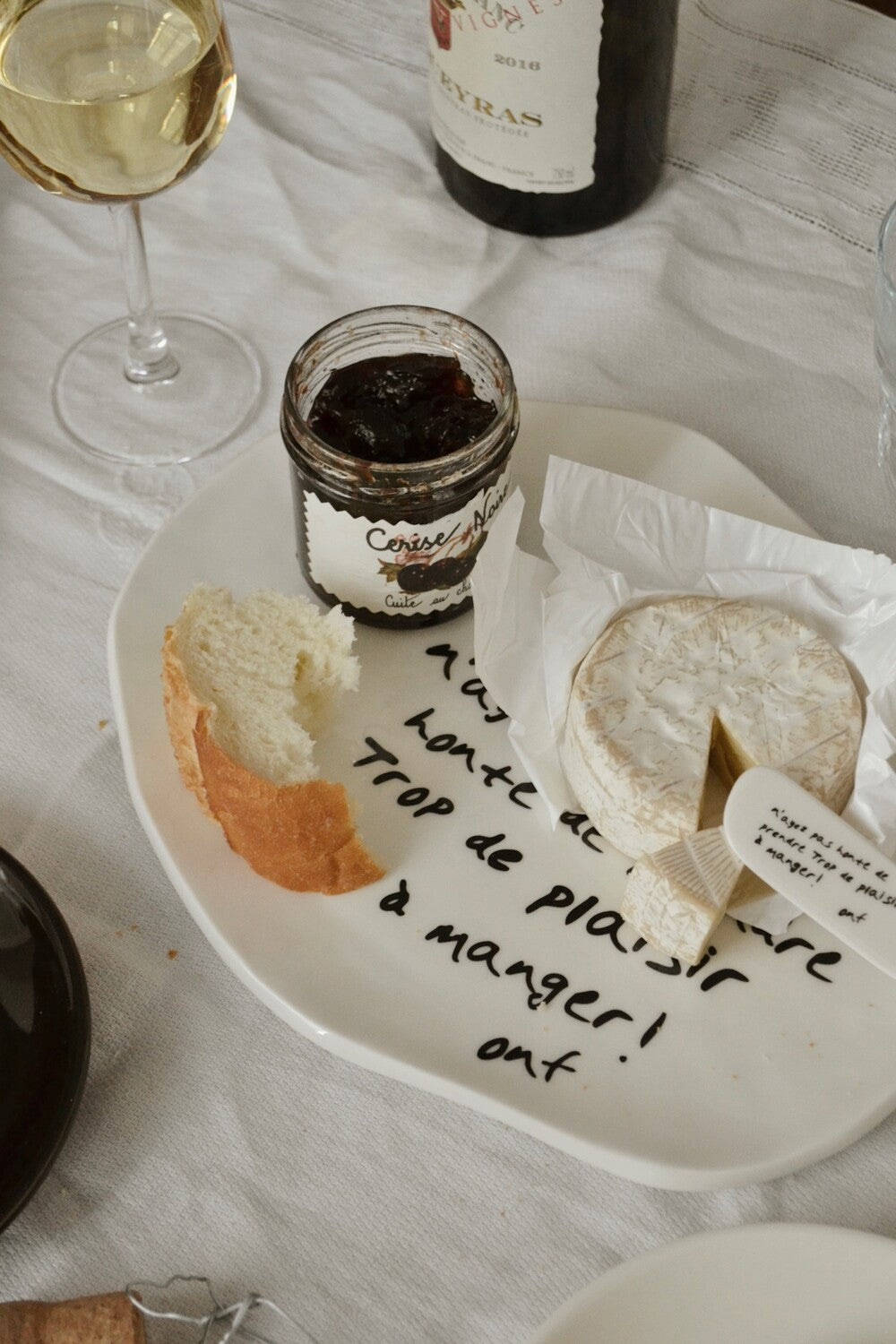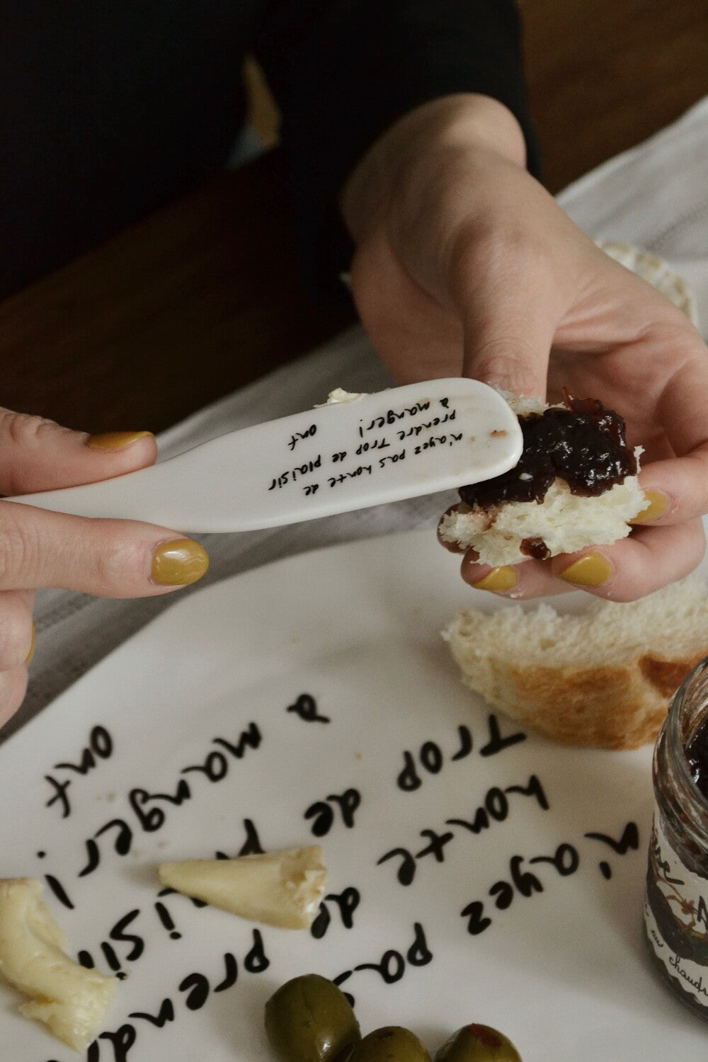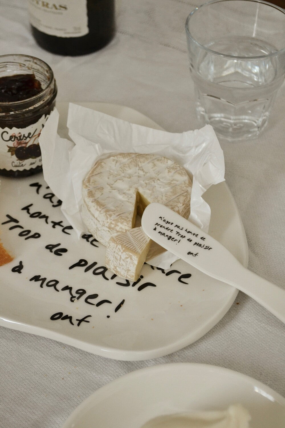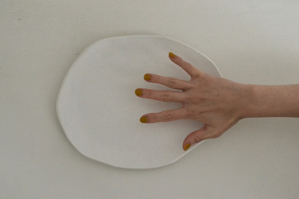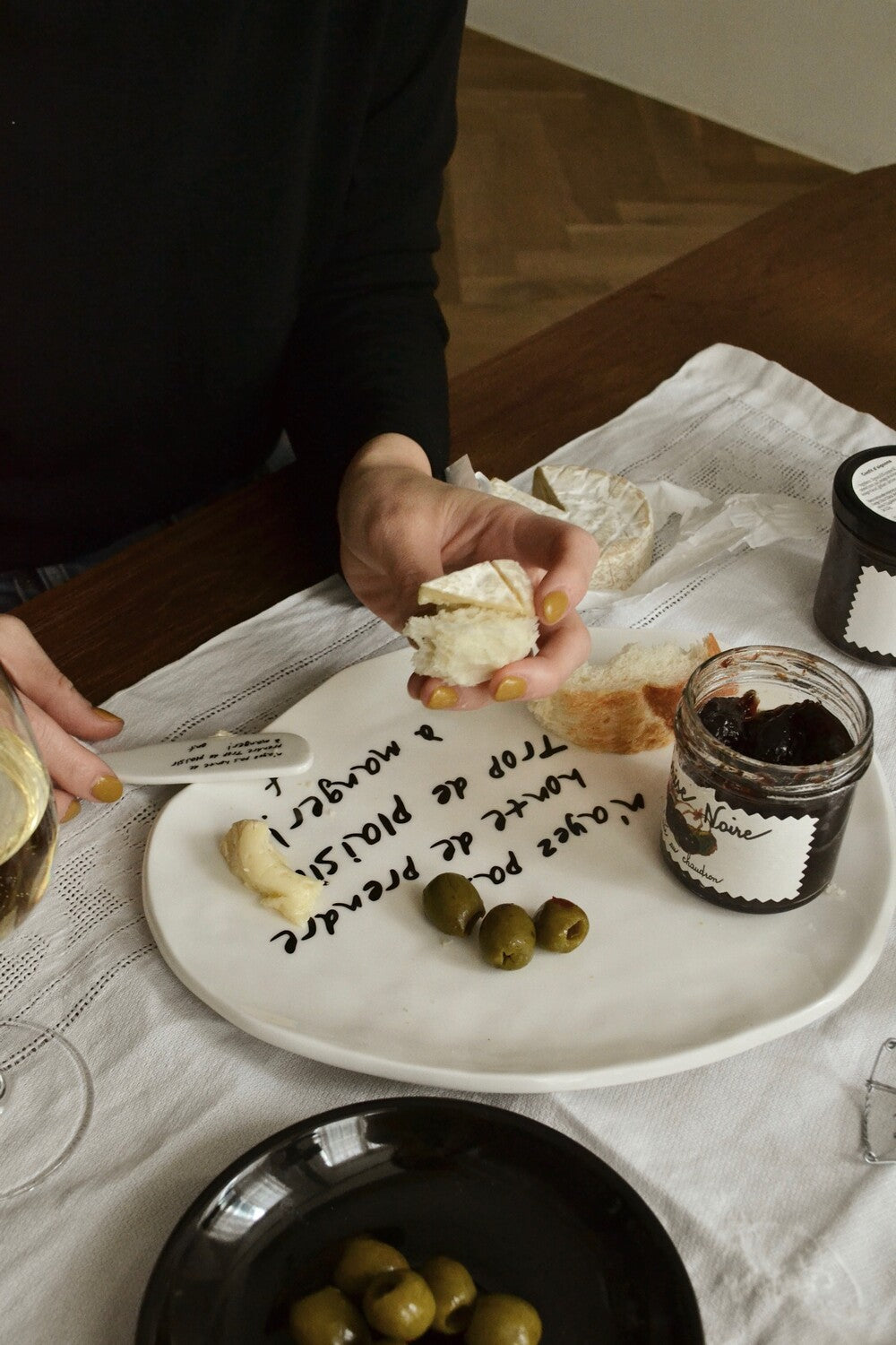 The 100% hand-crafted Gallet Plate & Knife Set reveals the sensual handprints of the potter, and features rough and natural lines. Milk and toast for breakfast, coffee and dessert for lunch, and cheese, butter, and charcuterie to accompany your favourite wine in the evening. With two designs, various plating is possible according to individual taste.