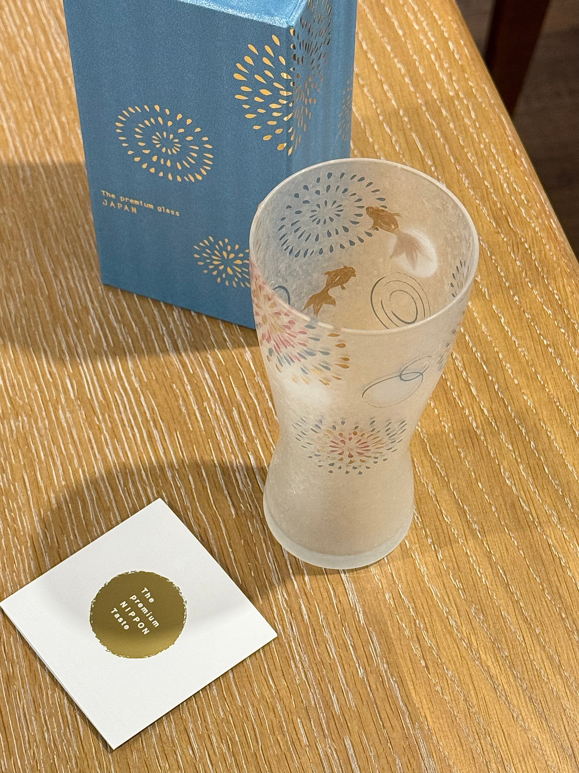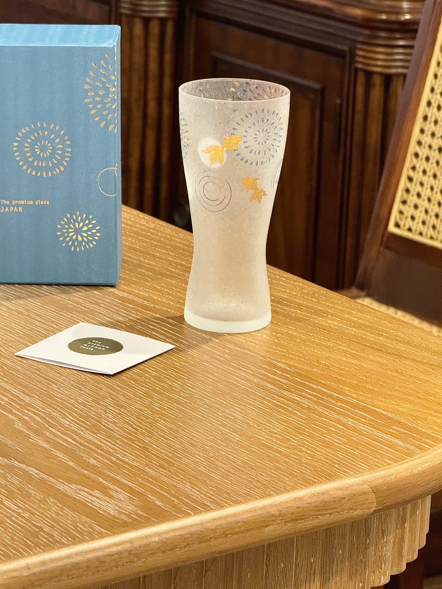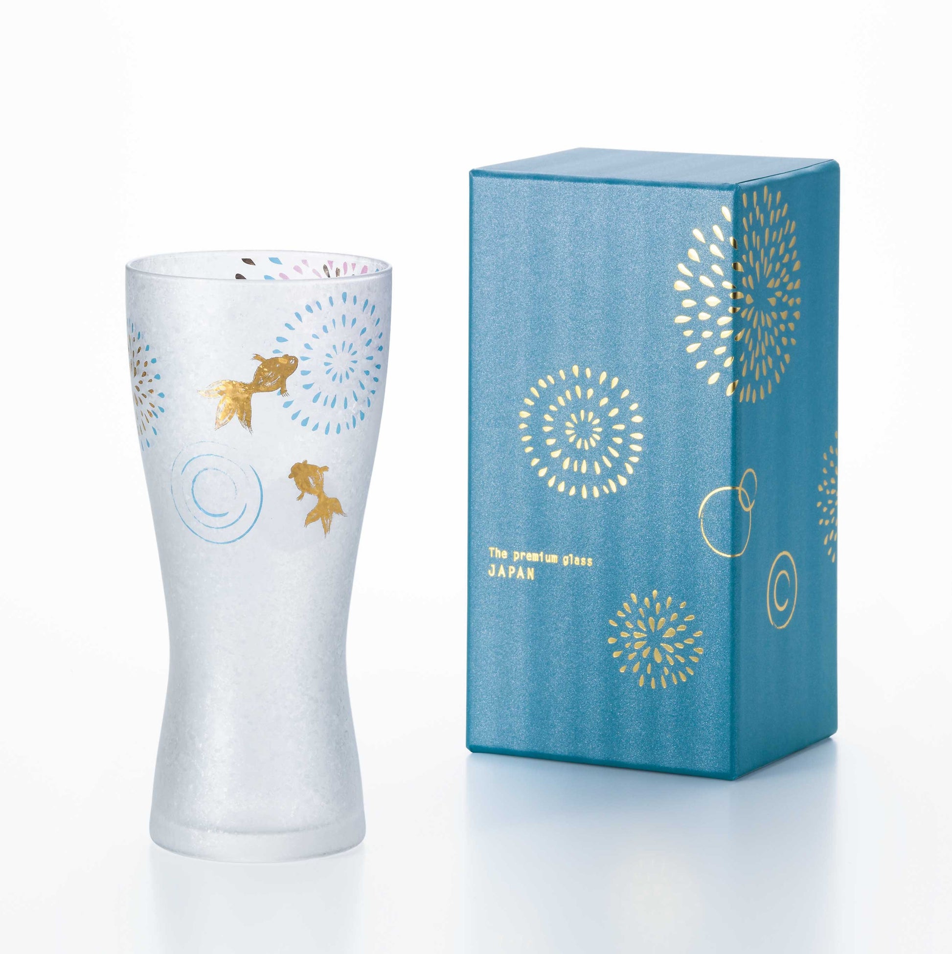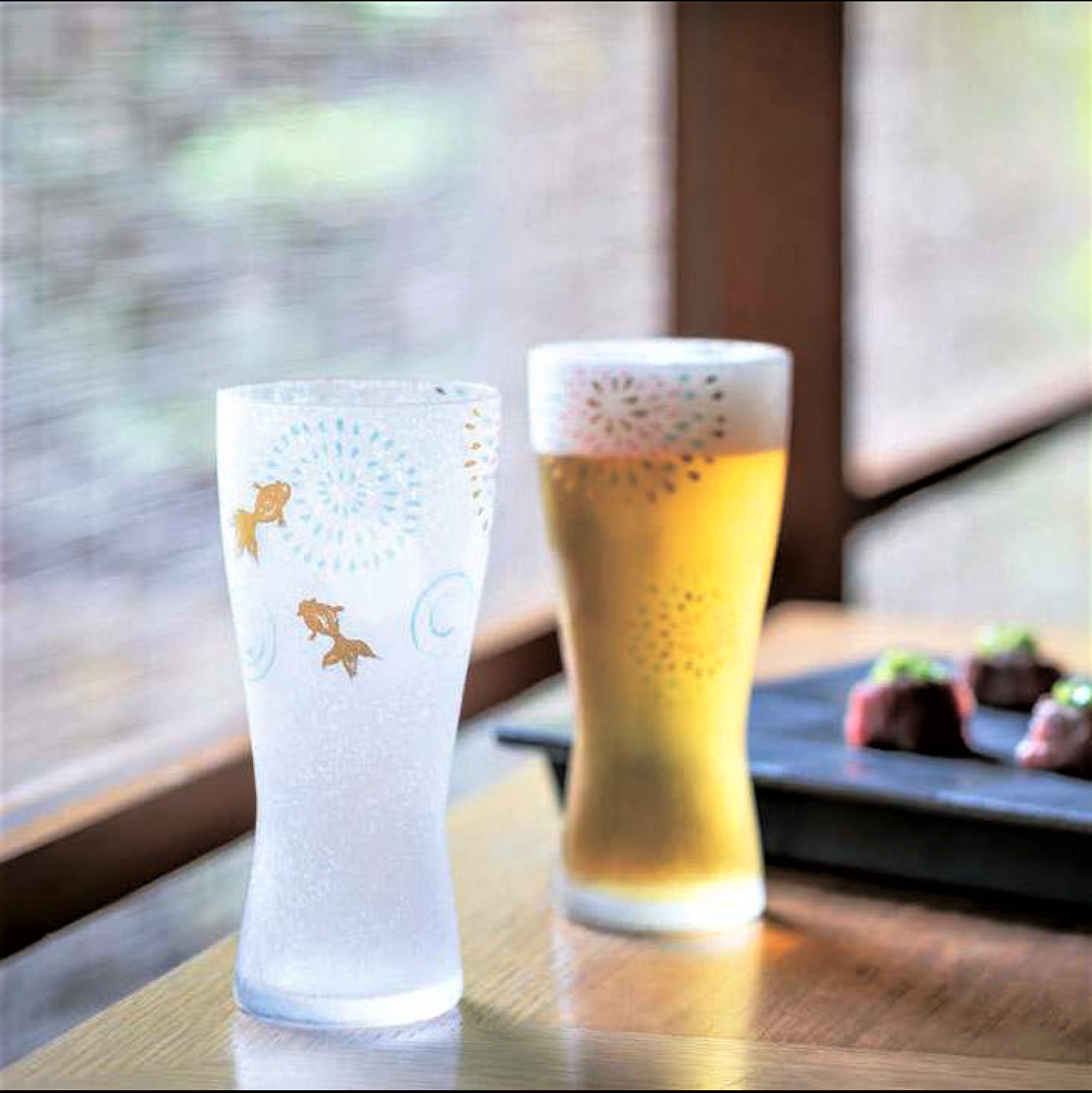 The print design on this beer glass represents firework of the summer festivals in Japan. It has a function of producing soft and creamy foam when pouring beer. The special design on the inside of the glass creates fine bubbles that hold its form.
