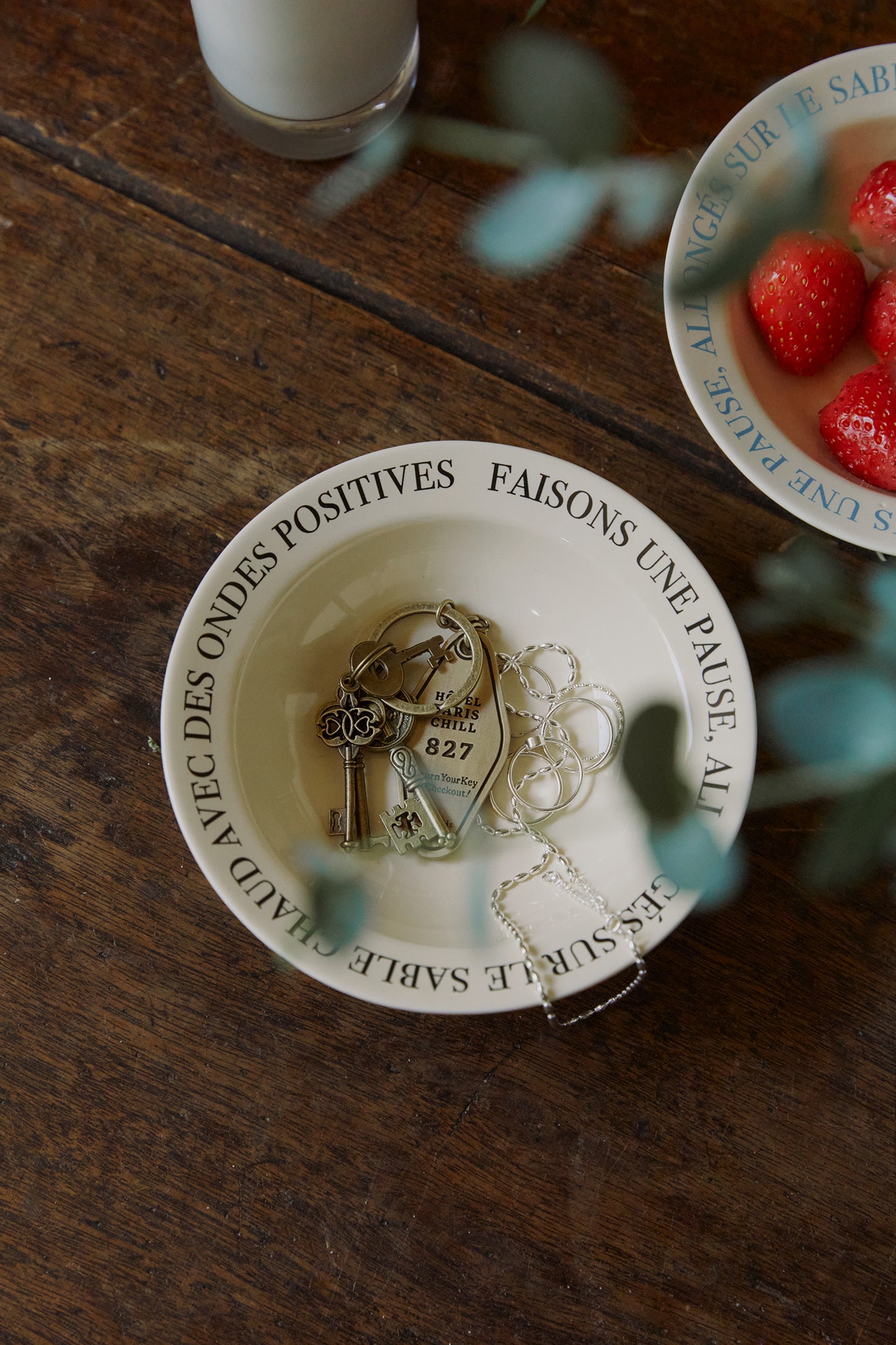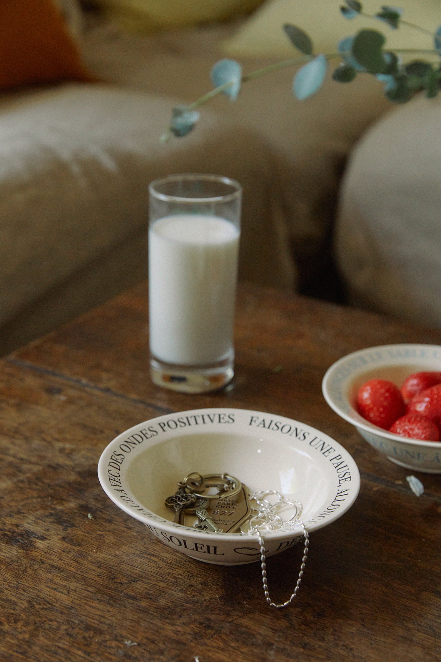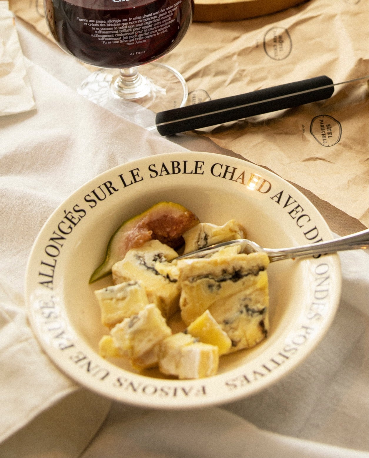 Coupe Bowl, features a soft creamy body color reminiscent of the laid-back French brunch, with French lettering printed on the front and top. It is a good choice for simple salads, yogurts, cereals, and other desserts.