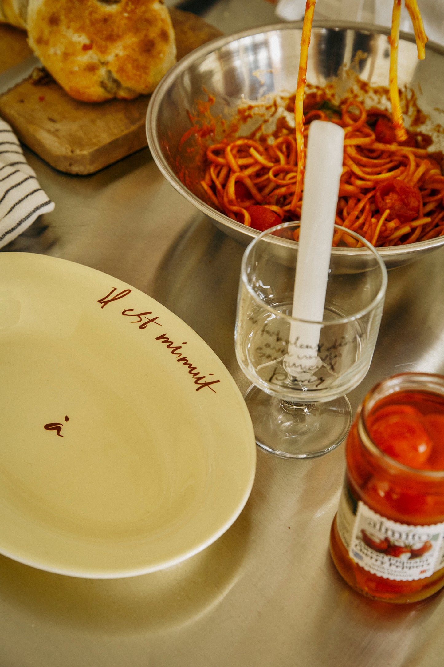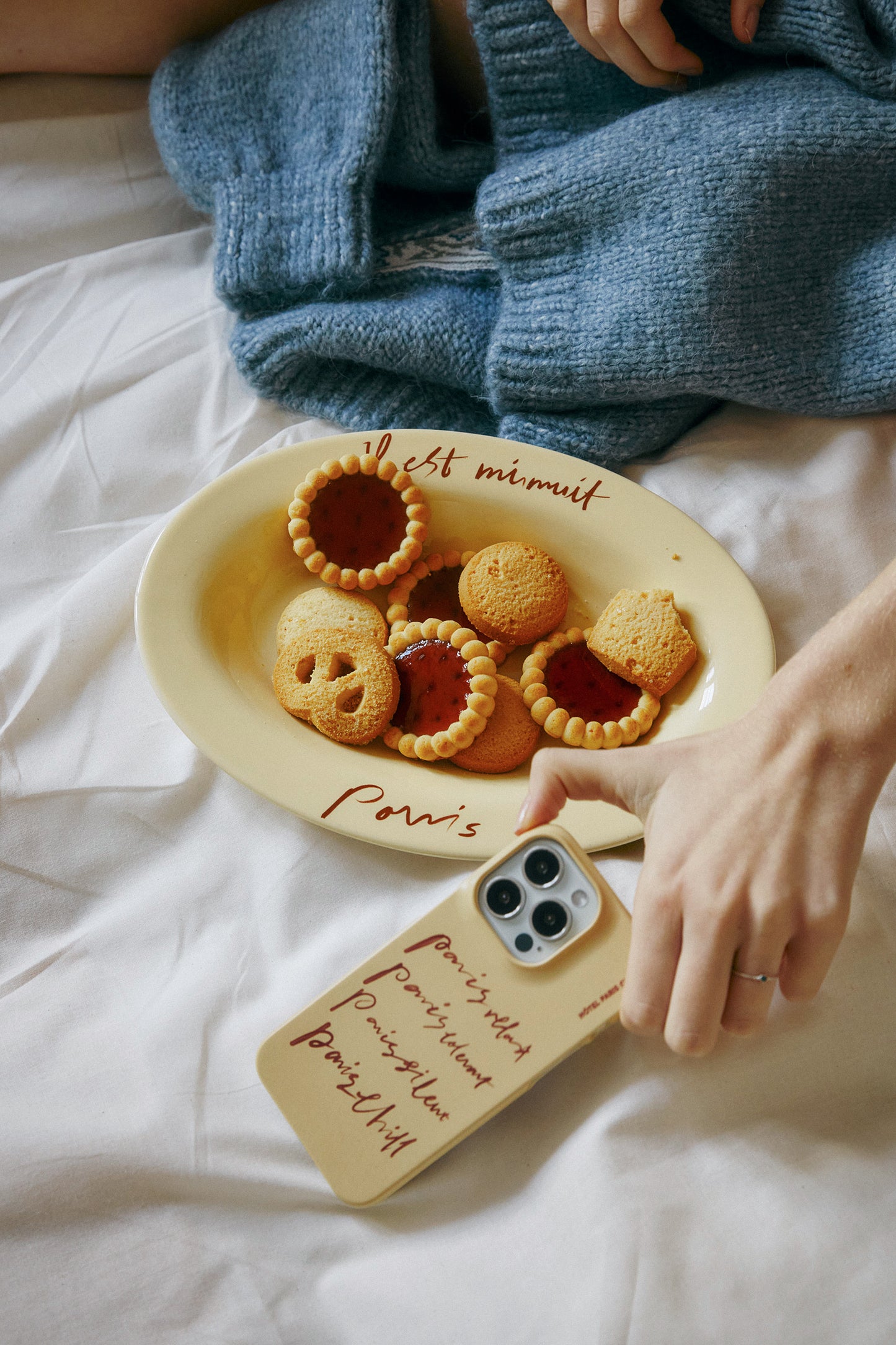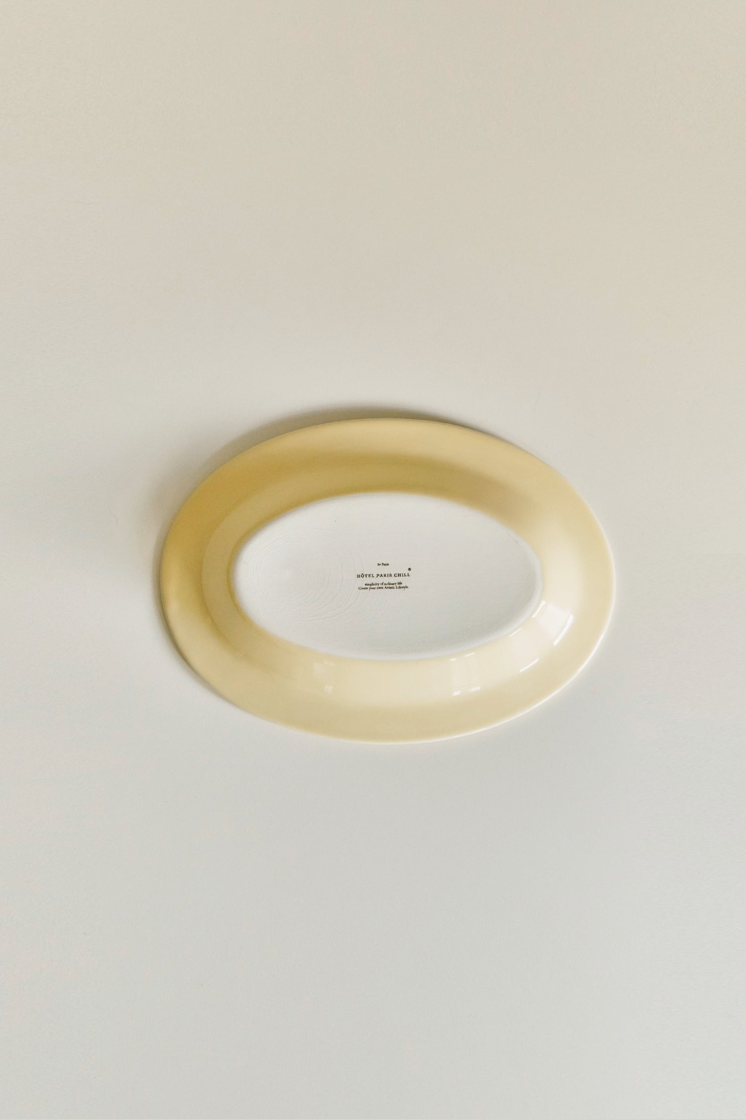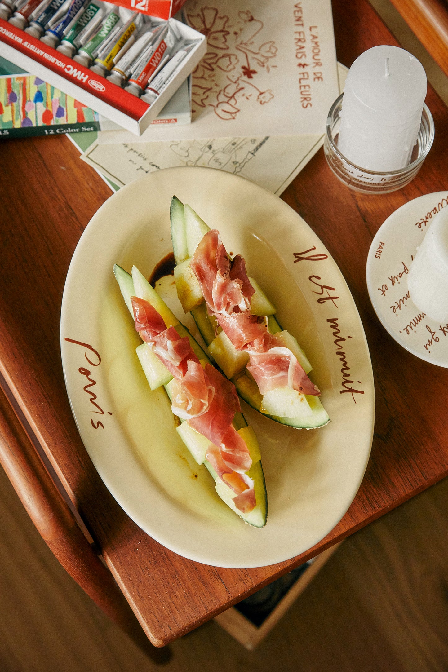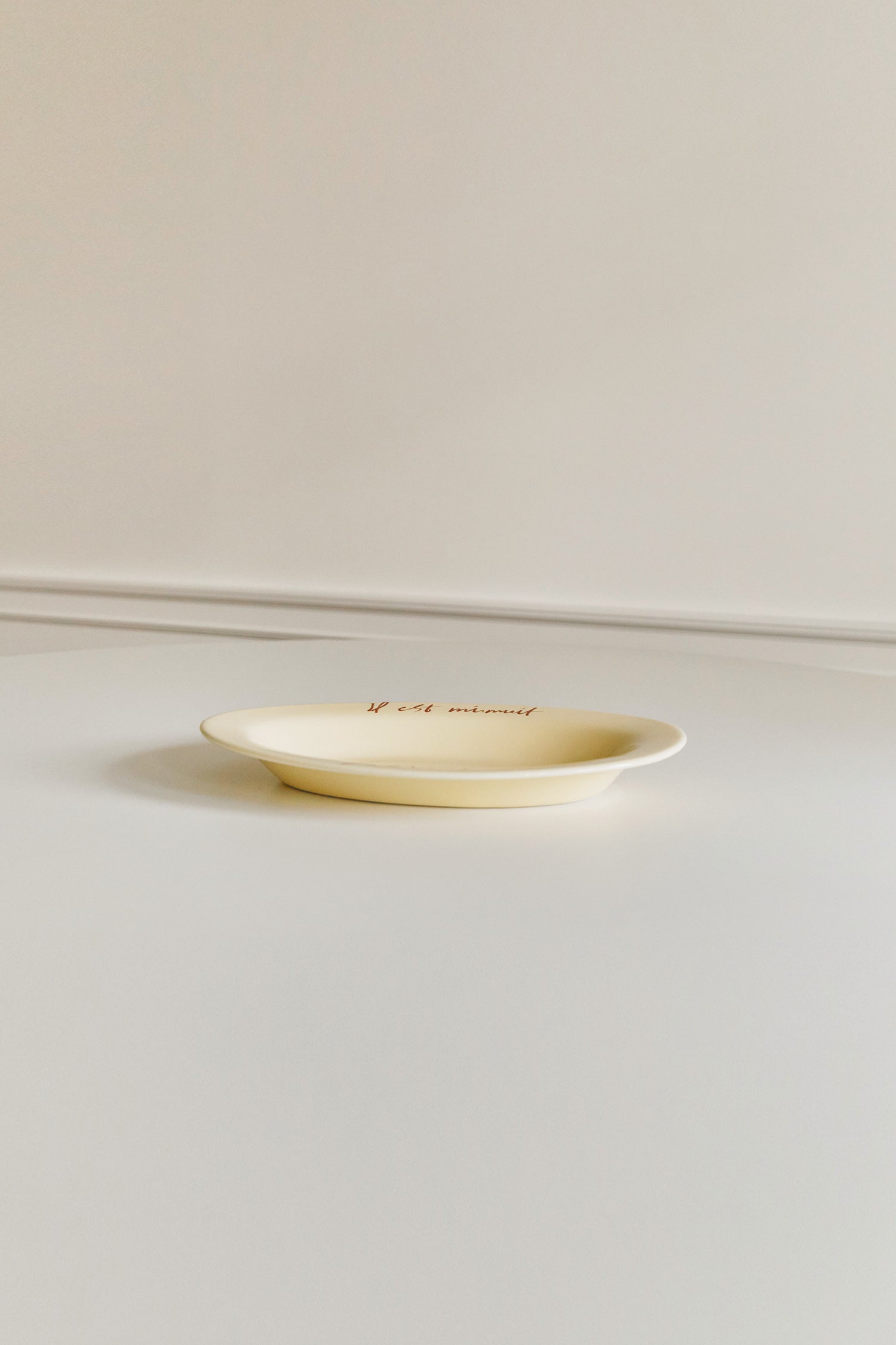 This plate features a toned-down yellow body with French handwriting of "It's Midnight in Paris".